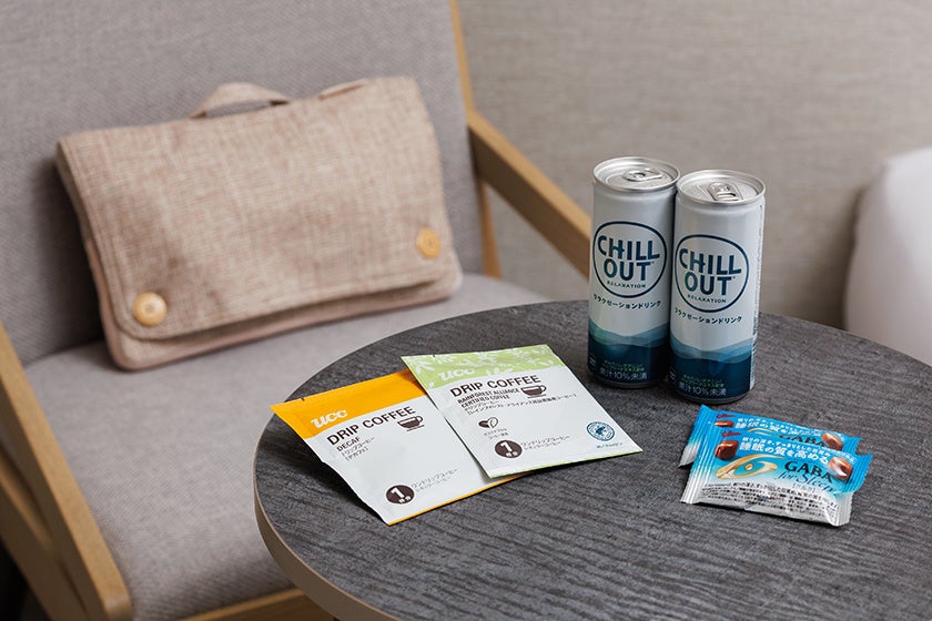 旅の疲れを癒すリラクゼーションドリンクやマッサージクッションを客室に用意します。