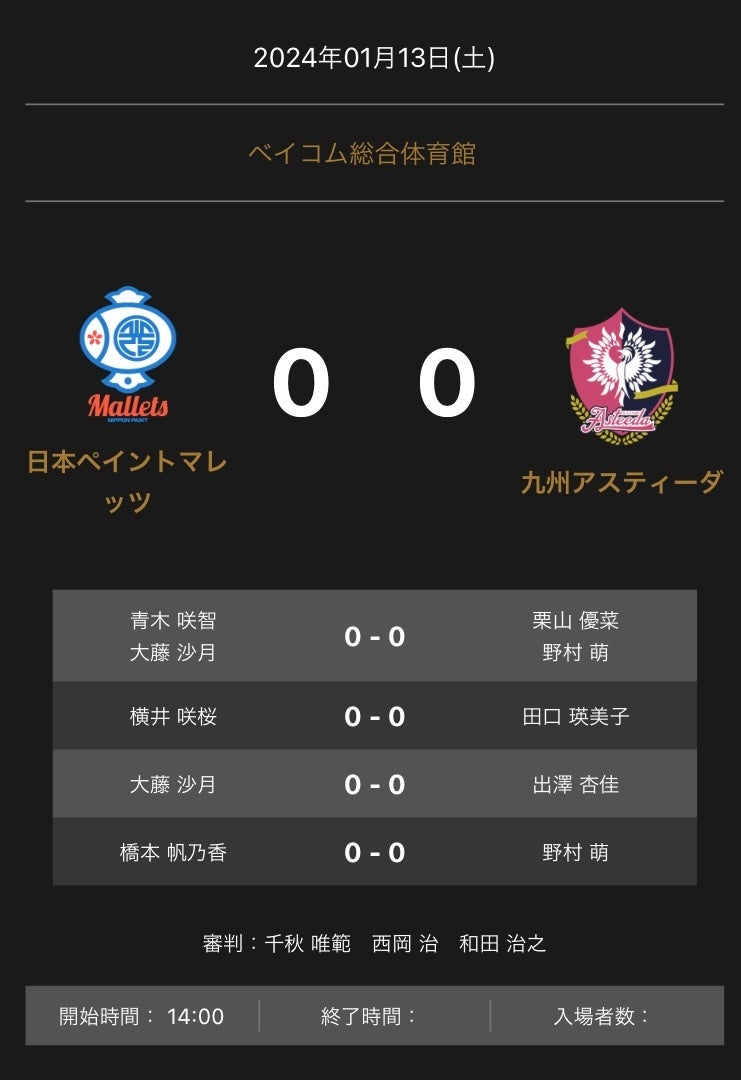ノジマTリーグ 2023-2024シーズン 公式戦 1月13日開催 日本ペイントマレッツ vs 九州アスティーダ オーダー発表