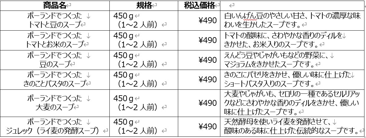 無印良品では世界の国や地域の食文化を取り入れて商品開発を行っています。今回は無印良品の新しいシリーズとしてポーランドの家庭で食べられているスープを商品化しました。ポーランドでは、バランスよく栄養を摂ることができる食事として麦やトマトなどの野菜をベースにしたスープに米やパスタ、豆などを入れて食べています。スープを食べる文化が根づいたポーランドの中でも代表的なものを中心に6種類を揃えました。全体450gとスープの量が多いため食事のメインとしたり、サイドメニューとして2人で分け合ったりできます。温めるだけで手軽にお楽しみいただけます。