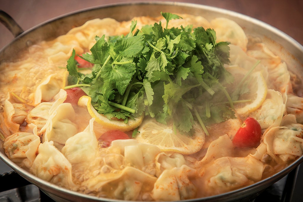 ジューシーな肉餡をツルツル&モチモチした皮が包む餃子の凄さは、美味しいタッグを組む相手を選ばないこと。ゆえにこのエスニックなスープに投入しても美味しくなってしまうのです。パクチー、レモン、トマトの爽やかトリオの働きで、さっぱりと召し上がっていただける鍋に仕上がっています。
