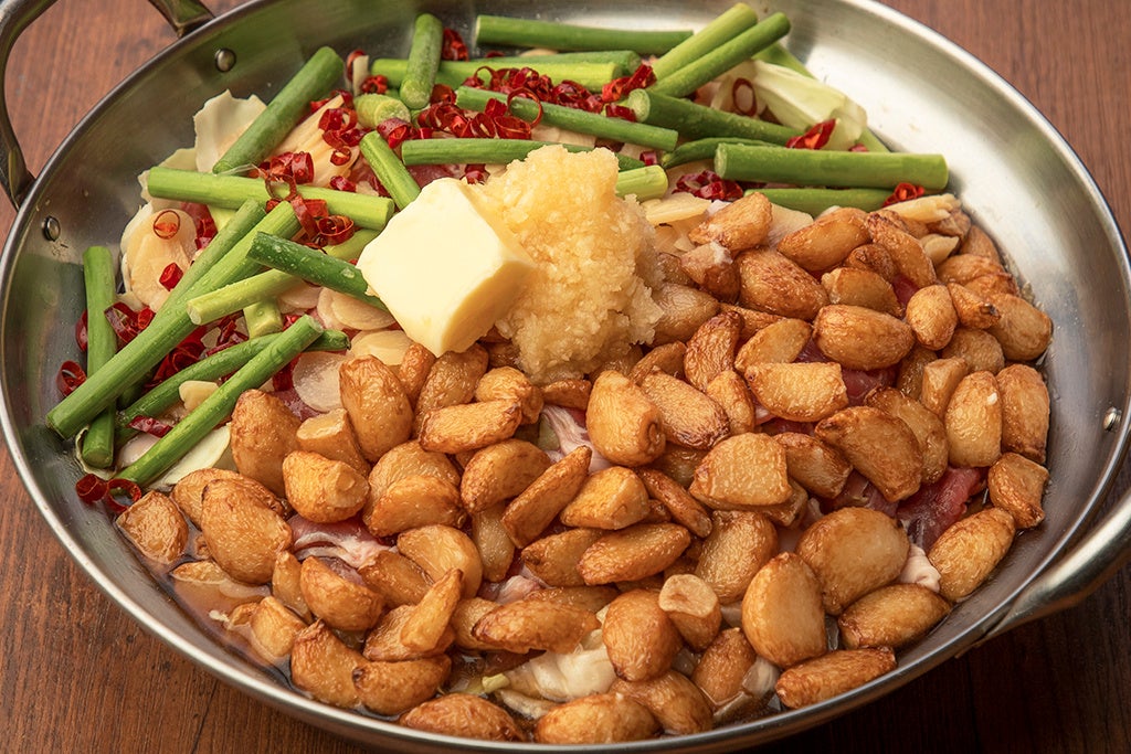 九州のご当地B級グルメとして発祥、平成初期の大流行を経て全国的な定番鍋となったもつ鍋と、令和の今、Z世代に大人気のチュクミ=イイダコを使った韓国の郷土料理を組み合わせた、平成×令和&日本×韓国のコラボ鍋。韓国料理特有の旨辛さはヤミツキ必至の味わいです。