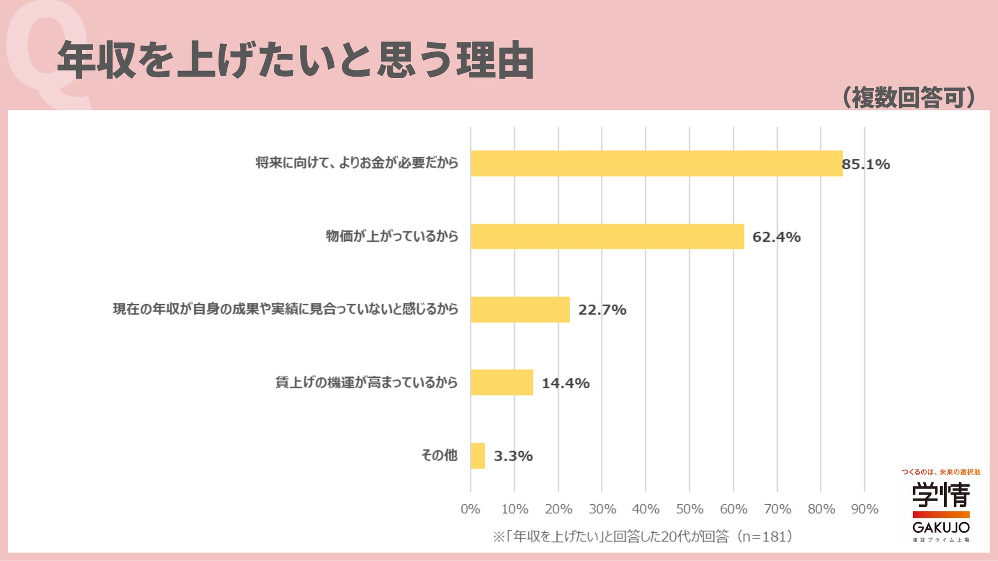 「現在よりも年収を上げたい」と回答した20代が95.7%。年収を上げたい理由は、「将来に向けて、よりお金が必要だから」が最多