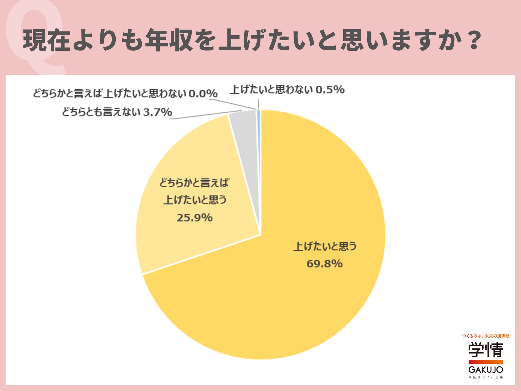 現在よりも年収を「上げたいと思う」と回答した20代が69.8%に上りました。「どちらかと言えば上げたいと思う」25.9%を合わせると、95.7%の20代が現在よりも年収を上げたいとしています。