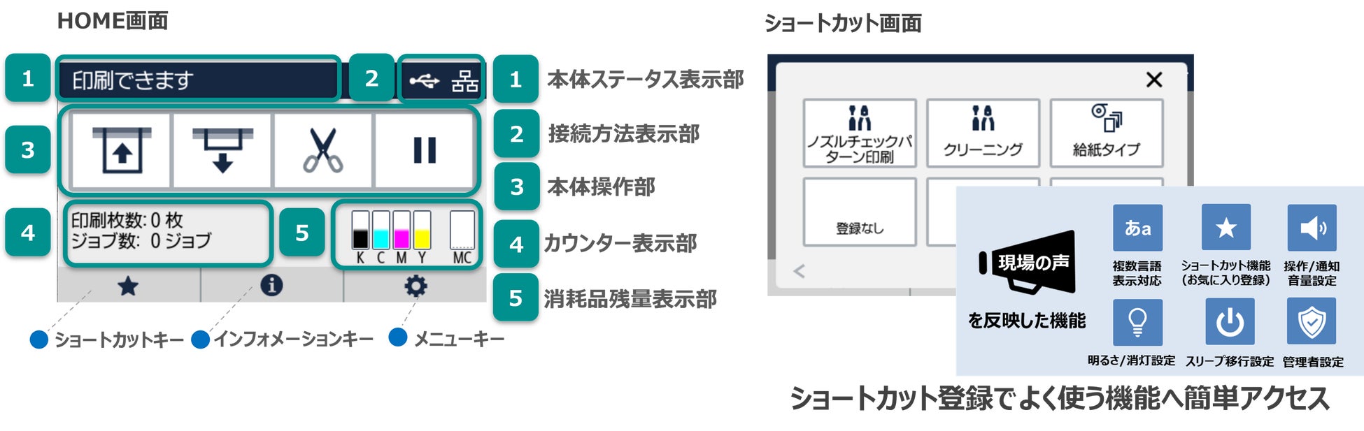 直感的に操作できる4.3インチの大型タッチパネルを搭載しており、よく使う操作はショートカットキーとして登録可能です。また、プリンターの状態やインクタンクの残量、用紙の残量、印刷枚数などを一目で確認することができます。