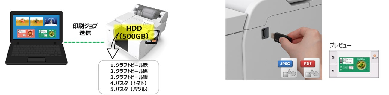 本体内部に500GBのハードディスクドライブ(以下、HDD)を搭載しており、印刷ジョブを保存してHDDからの再印刷を簡単に行うことができます。また、USBダイレクト印刷機能を搭載しており、JPEG、PDFのファイルフォーマットに対応しています。PCがなくても、本体パネル上でプレビューを表示し、その場で印刷することが可能です。さらに、設置スペースが限られた作業場に設置でき、必要なラベルだけオンデマンドで印刷することができます。