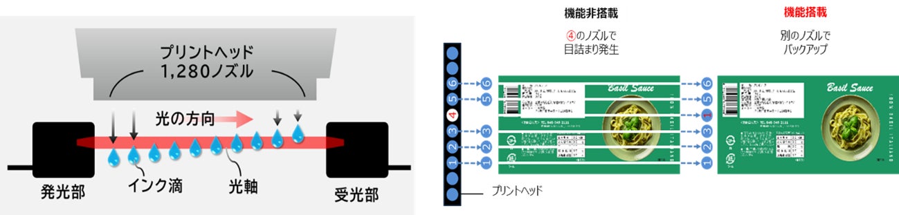 プリントヘッドのノズルからのインク吐出をセンサーで精密にチェックし、目詰まりを検知すると別のノズルによって自動的に補完※6 します。これにより、目詰まりによる色ムラなどの失敗プリントを低減するほか、目詰まりを解消するためのヘッドクリーニングの回数を減らして、インクのムダを抑制します。