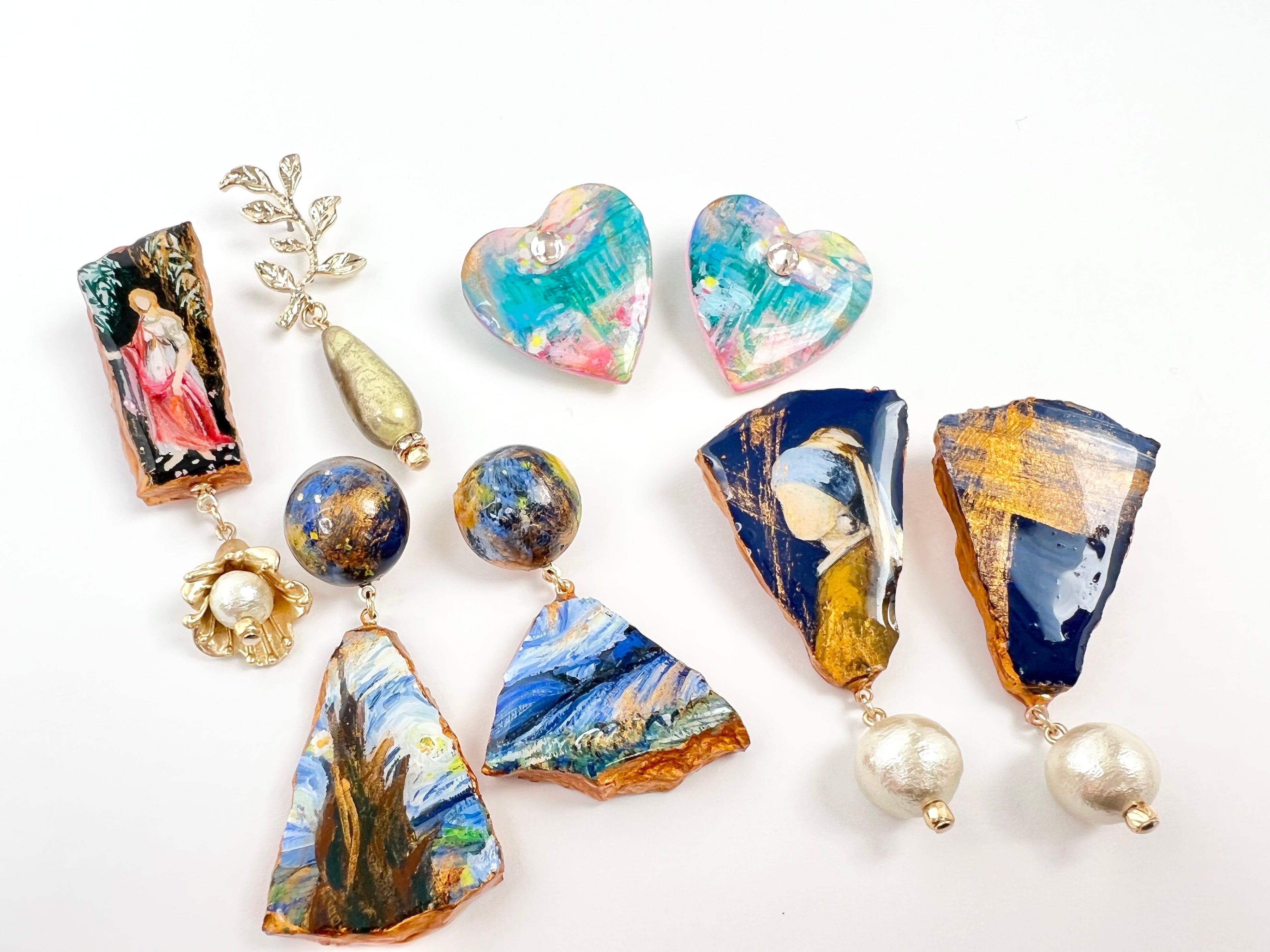 ブランド名の「A+u」は、“artをあなたに”という意味。アートを身にまとうように、アートを身近に感じてほしいと、アクセサリーは一つひとつ手描きで制作されています。