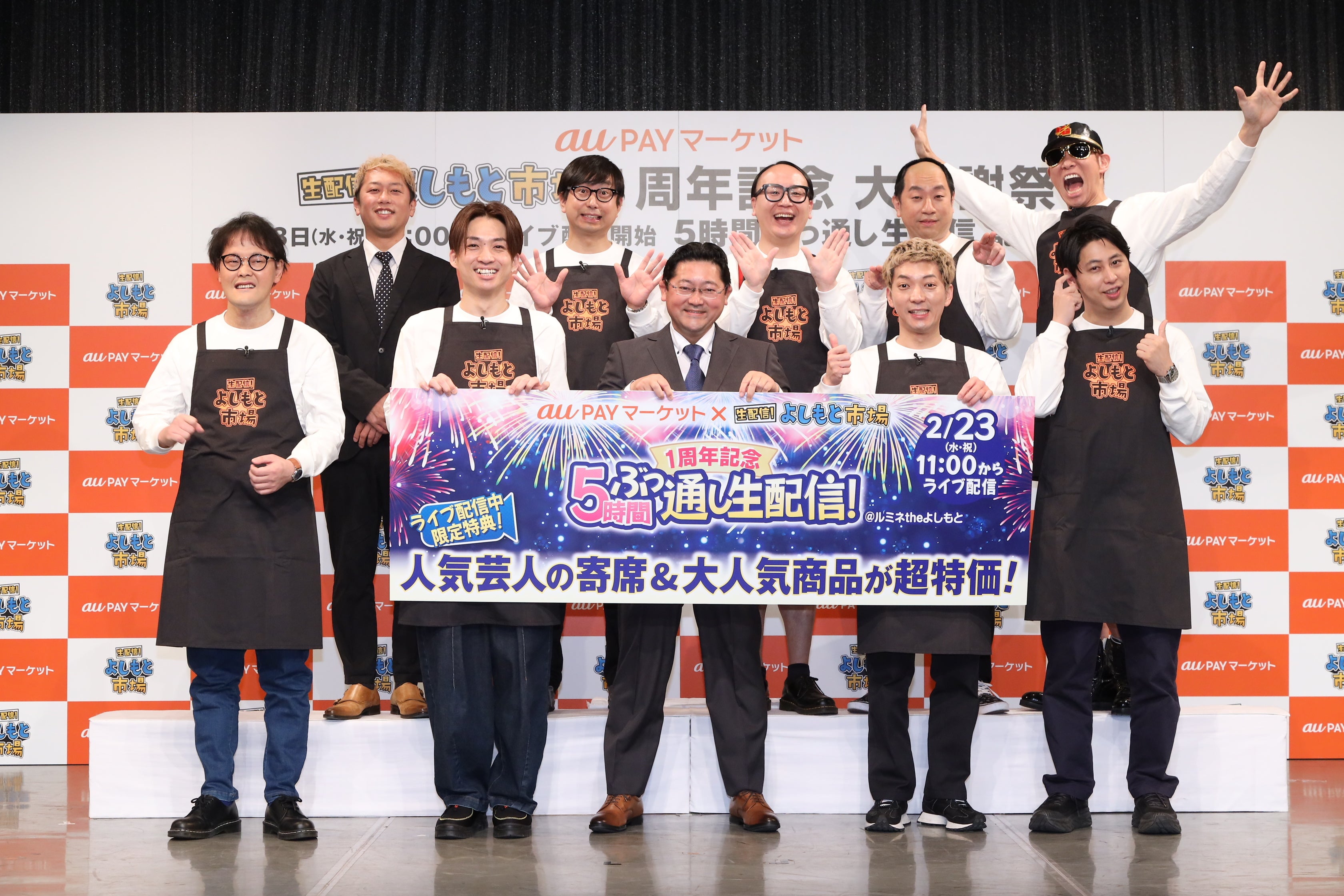 両社は2022年2月8日に「ルミネtheよしもと」にて、本番組説明の記者発表会を実施し、株式会社よしもとセールスプロモーション 取締役 山地克明とau PAY マーケットを運営するauコマース&ライフ株式会社 代表取締役社長 八津川 博史がそれぞれ挨拶しました。そのほか、「生配信!よしもと市場」のレギュラーメンバーであるよしもと人気芸人も登壇し、2月23日に配信する5時間ぶっ通し生配信についての意気込みを熱いトークで披露しました。