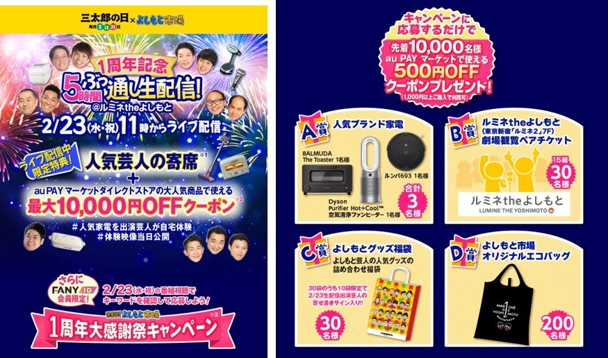これを記念して、au PAY マーケット「ライブTV」初となる“ぶっ通し5時間生配信の特別番組を2022年2月23日(水・祝)11:00から実施いたします。本番組では、人気商品がライブ配信中限定のクーポンやタイムセールにより超特価で登場し、人気芸人が多数出演するライブ配信限定のお笑い寄席ライブもある、見て、買って、笑っての超スペシャルなライブ配信を予定しております。そのほか、吉本興業ではコミュニティサイト「FANY ID」会員さま限定で、本番組配信中に発表するキーワードを確認して応募するキャンペーンもご用意しております。