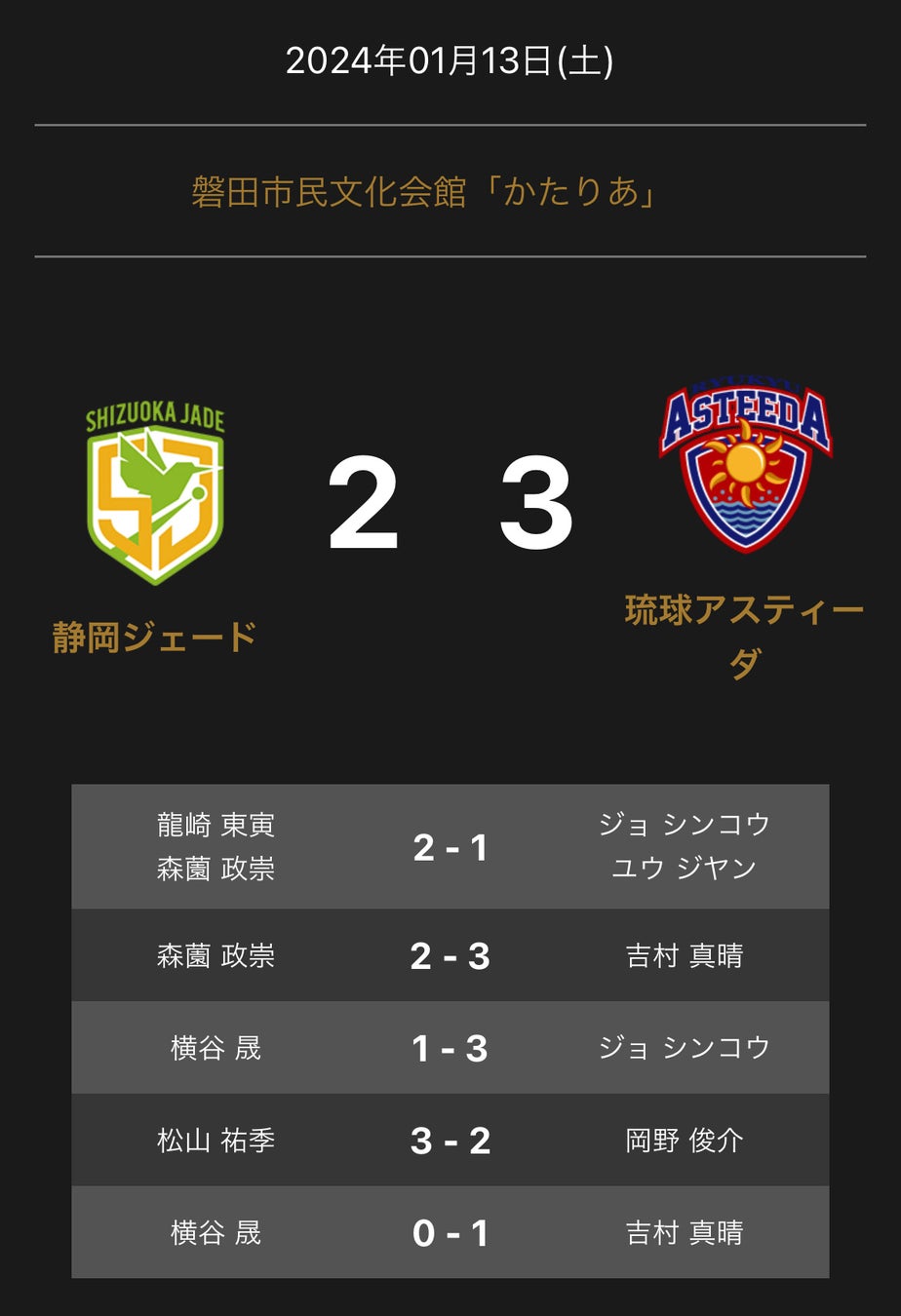 ノジマTリーグ 2023-2024シーズン 公式戦 1月13日開催 静岡ジェード vs 琉球アスティーダの試合は3-2で琉球アスティーダが勝利しました。