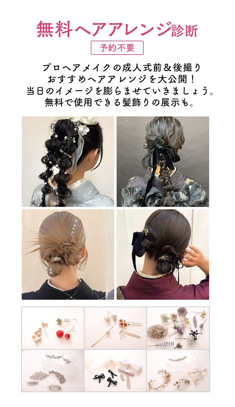 「振袖は可愛いけれど、自分に似合う髪型がわからない…」そんな不安を抱えたまま衣装を決めるのは難しいものです。そこで、展示会場ではプロのヘアメイクアーティストによる「無料ヘアアレンジ診断」を実施します。