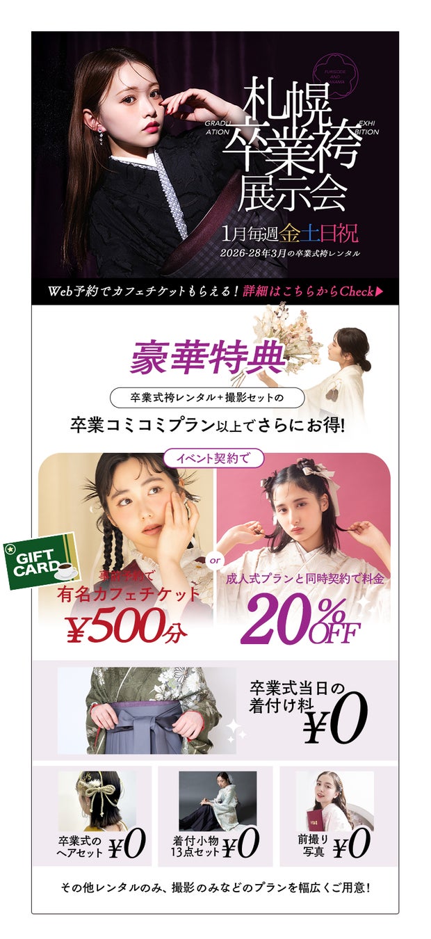 今回、札幌エリアの旗艦店である札幌中央店とサッポロファクトリー店において、【成人前撮り相談会】と【卒業袴展示会】を開催することを決定いたしました。