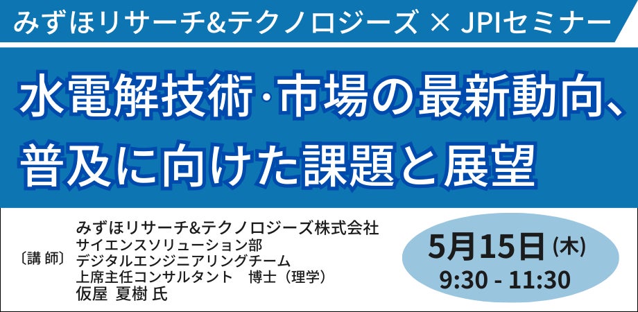 JPI(日本計画研究所)は、みずほリサーチ&テクノロジーズ株式会社 サイエンスソリューション部 上席主任コンサルタント 博士(理学) 仮屋 夏樹 氏を招聘し、水電解技術・市場の最新動向、普及に向けた課題と展望について詳説いただくセミナーを開催します。
