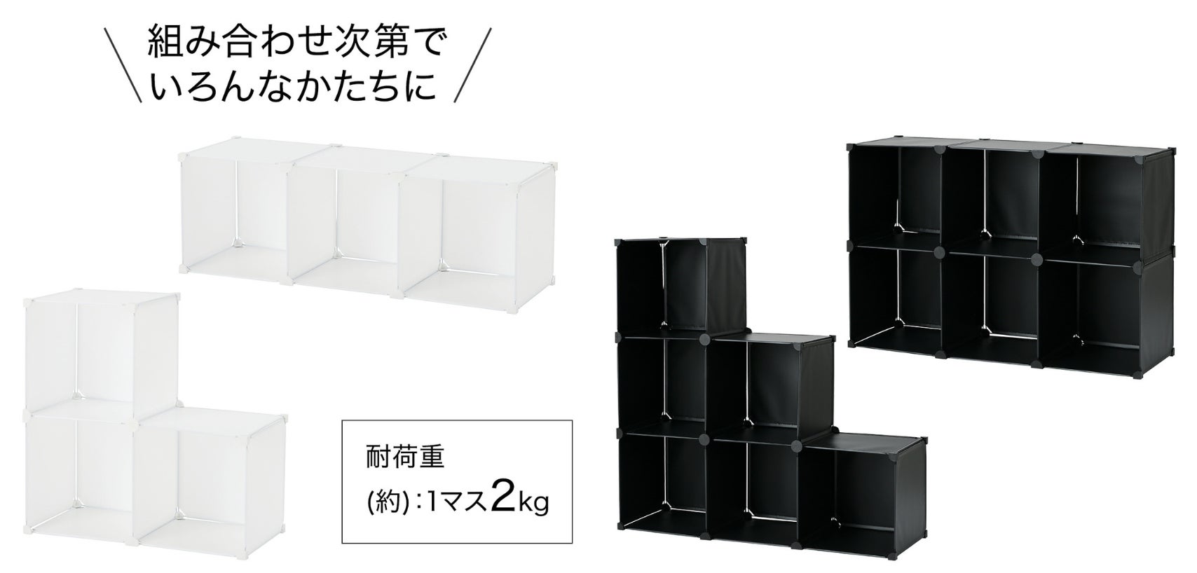 各ボックス1個あたりの耐荷重は約2kgとなっており、雑貨や本、おもちゃなど日常的によく使うアイテムの収納に十分な強度を確保しています。
