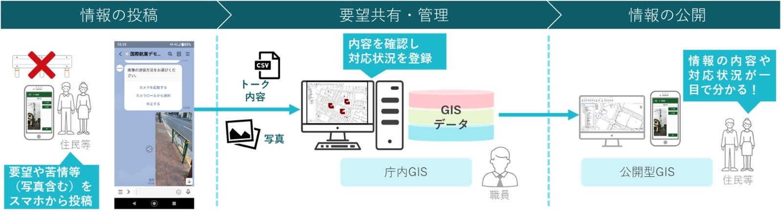 LINE経由で道路不具合等の通報をGISへ連携するソリューションを提供