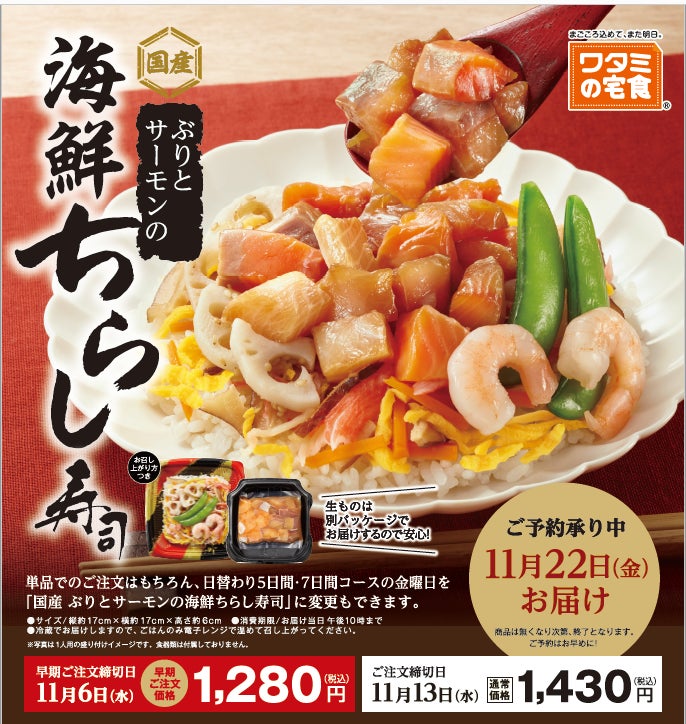 「ワタミの宅食」では季節や行事を感じていただけるよう、数量限定で特別弁当の販売を行っており、2024年度は月替わりでの販売を行っております。今回販売します「国産 ぶりとサーモンの海鮮ちらし寿司」は、11月22日(金)にお届けをします。