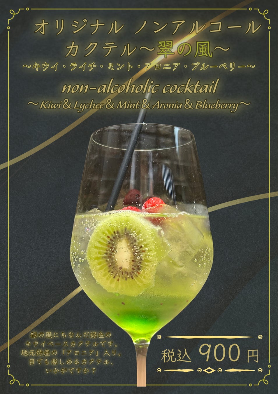 オリジナルモクテル「翠の風(みどりのかぜ)」は、キウイフルーツやブルーベリー、ラズベリー、「北のスーパーフード」と呼ばれるアロニアも添えて、見た目は可愛らしく。味は新鮮なキウイフルーツをベースに、ライチやミントでさっぱりとした味わい。