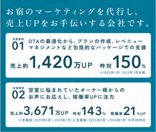 旅館・ホテル向けのマーケティングソリューション。 人手不足で悩まれている施設事業者様の集客部分を全て丸投げいただく事で、事業者の皆様が「おもてなし」に注力できる環境を作り、「稼働率」「単価向上」「集客コスト削減」を改善します。