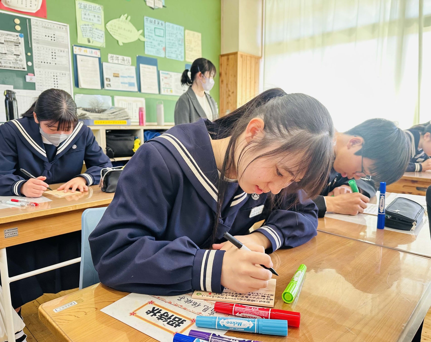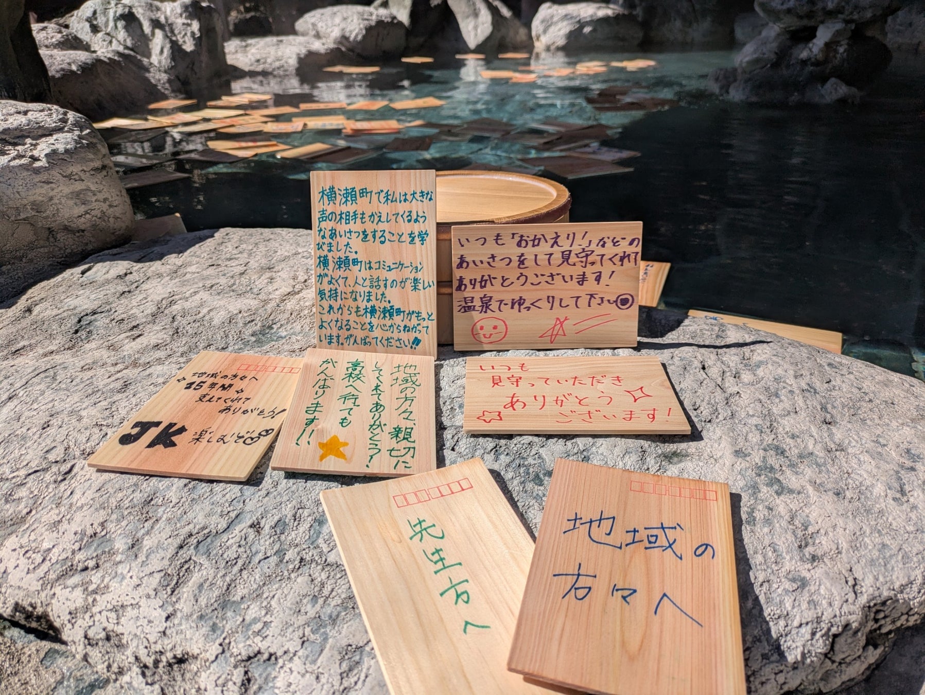 今年の卒業生からの「地域の方に向けた感謝のメッセージ」が書かれたヒノキ入浴木がお風呂に浮かびます。温泉を楽しみながら地域の子供たちからのメッセージを読んで、心も身体もほっこり温まっていただければと思います。