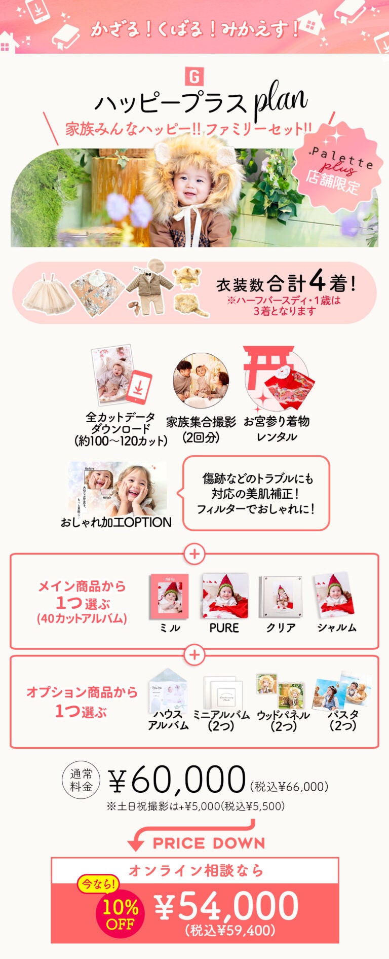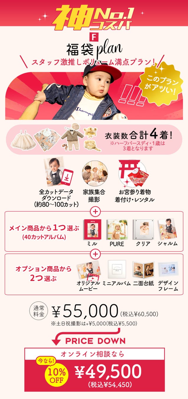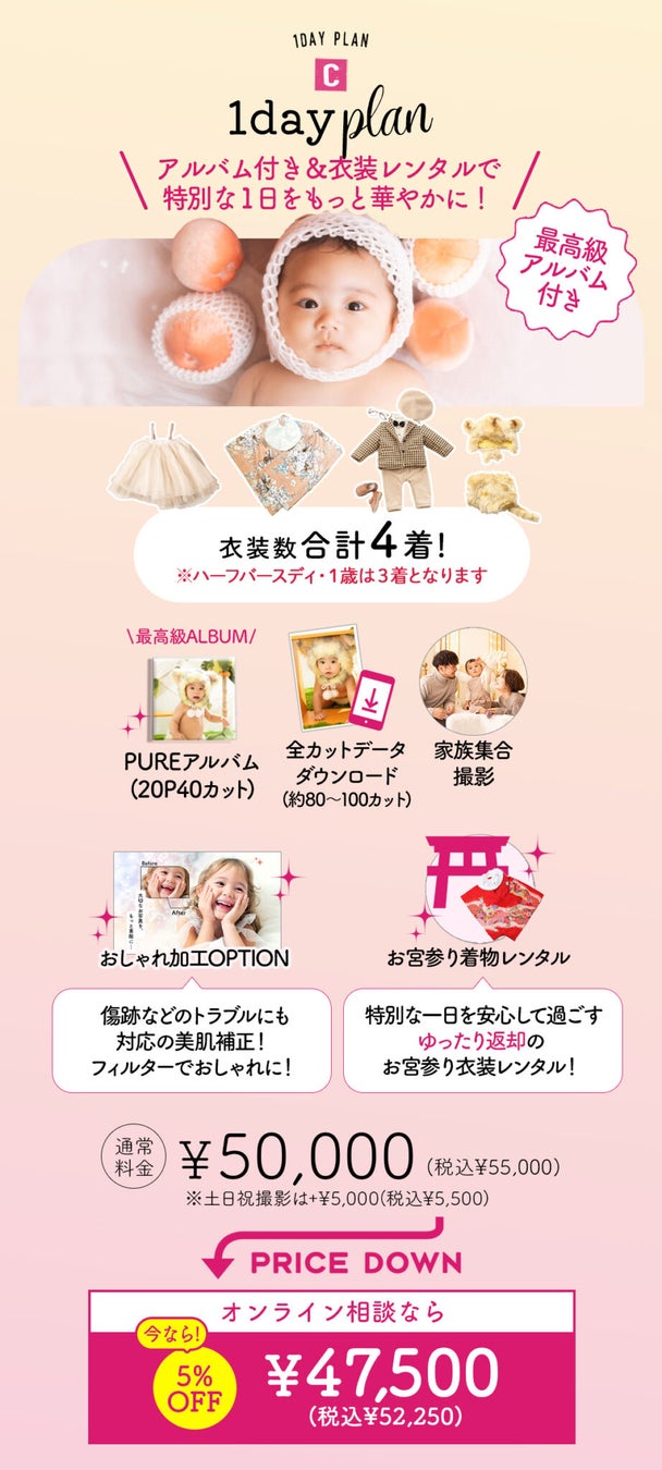 プラン内容: 最大4着の衣装、全データダウンロード、家族撮影、お宮参り着物レンタルが含まれる充実の内容です。