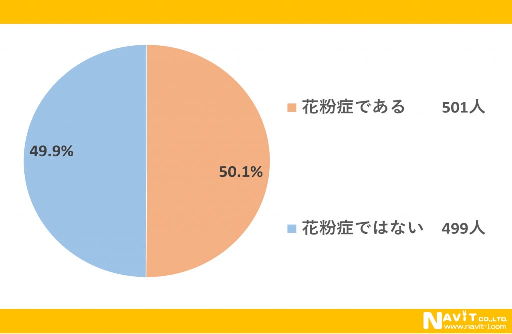 あなたは花粉症ですか?というアンケートに対して、「花粉症である」が50.1%で「花粉症でなはない」という人が49.9%という結果になりました。何だか謎のバランスが取られているような結果となりました。