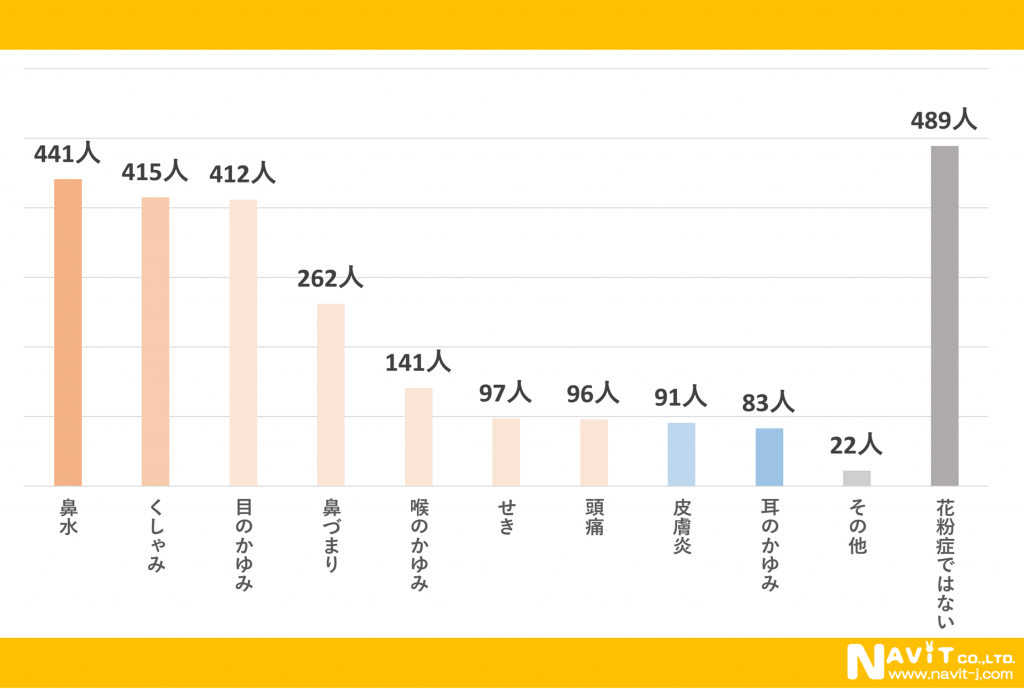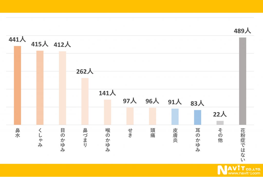花粉症の症状で1番多かったのは「鼻水」で441人となっています。複数回答のアンケートですが、全体のバランスで評価すると、花粉症の人の大部分は鼻水が出るという症状があるようです。次に多かったのが、「くしゃみ」で415人です。この2つの症状は学校や職場での振る舞いに困る症状です。3番目が「目のかゆみ」で412人。この3つの症状は、ほとんどの方に出ている症状のようです。