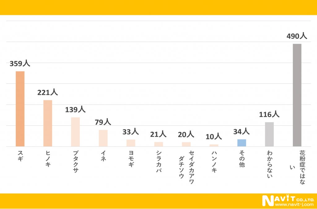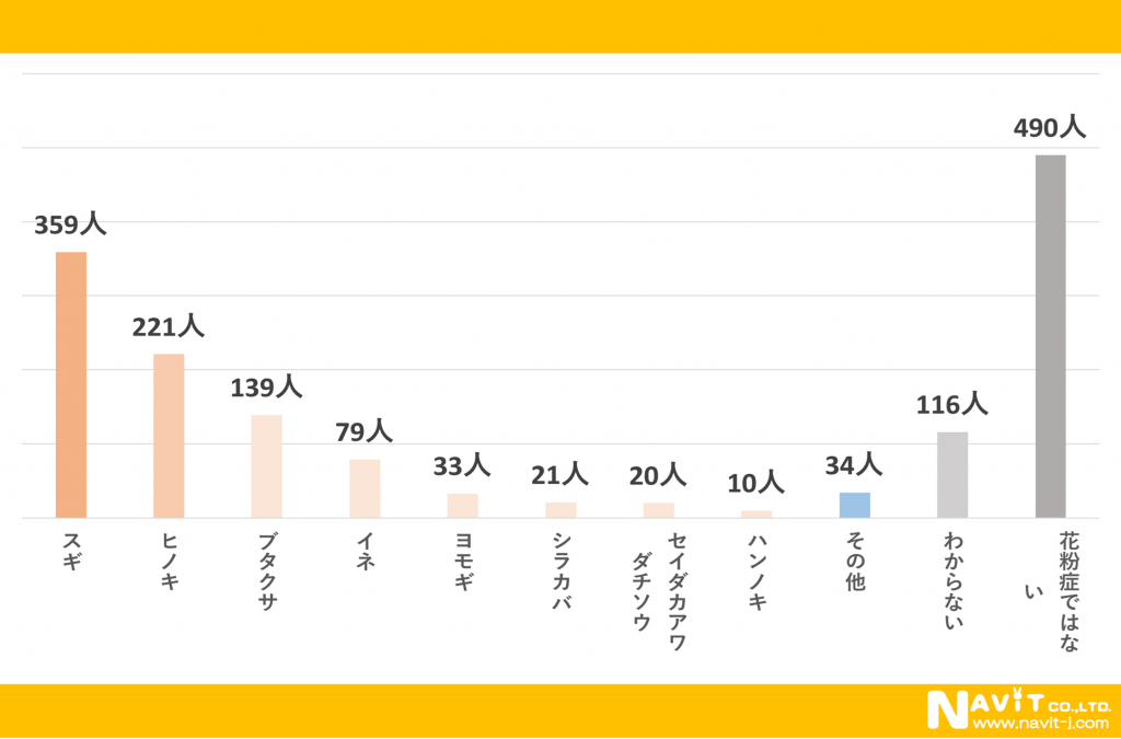 花粉症の原因を確認したところ、1番多かったのが「スギ」で359人となっています。次いで多いのが「ヒノキ」の221人です。TV CMの映像などでも使われる木ですね。やはり日本の森林面積の約7割を占める割合で植林されているだけのことはあります。
