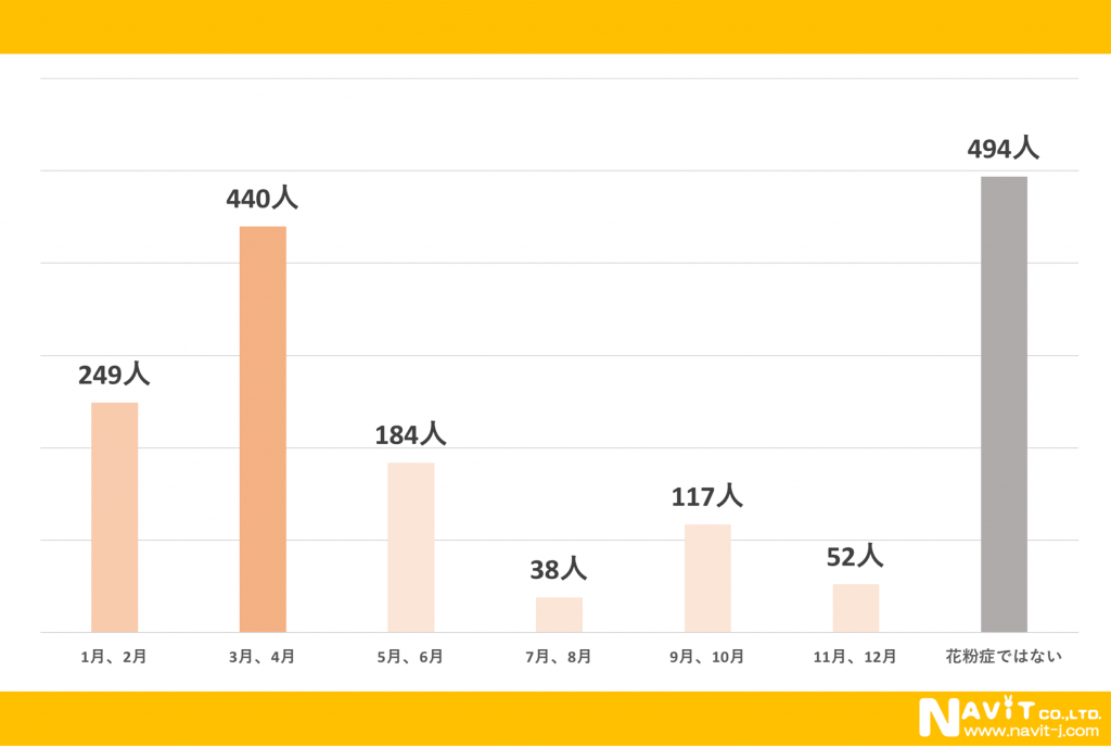 複数回答でお答えをいただいたアンケートでは、「3月、4月」に花粉症になる人が最も多く440人になりました。次に多かったのが「1月、2月」で249人、3番目が「5月、6月」で184人となっています。今回のアンケートは複数回答ですので、1月から始まってピークが3月、4月。そして6月頃まで緩やかに続くという感じなのでしょうか。