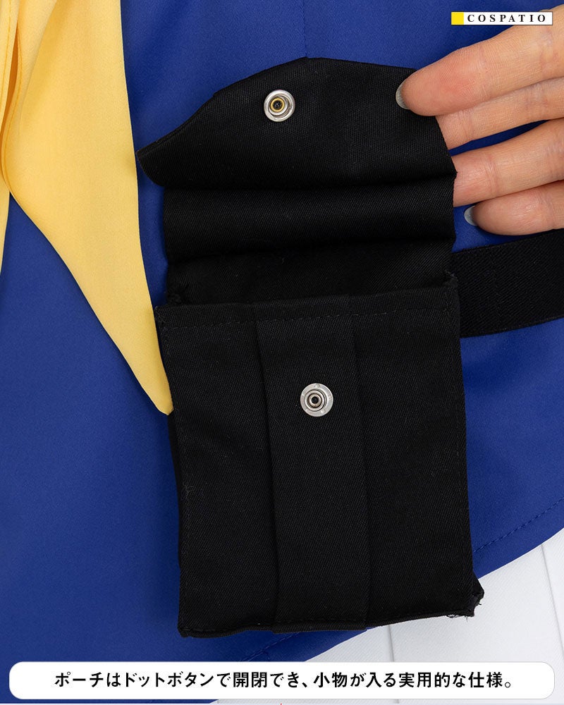 素材:ブラウス表地(ポリエステル100%)、ゴム(ナイロン、ポリエステル、ラバー)、スカーフ表地(ポリエステル100%)、ポーチ表地(ポリエステル65%、綿35%)、グローブ表地(ポリエステル82%、ポリウレタン18%)