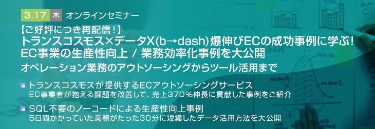 【トランスコスモスオンラインセミナー】【ご好評につき再配信!】トランスコスモス×データX(b→dash)爆伸びECの成功事例に学ぶ!EC事業の生産性向上/業務効率化事例を大公開を3/17(木)に開催