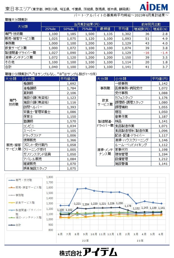 【2023年6月 パート・アルバイトの募集時平均時給】東日本エリアの平均時給は1,141円、西日本エリアの平均時給は1,083円、関東4都県の「飲食サービス職」は前年同月比23ヵ月連続プラス