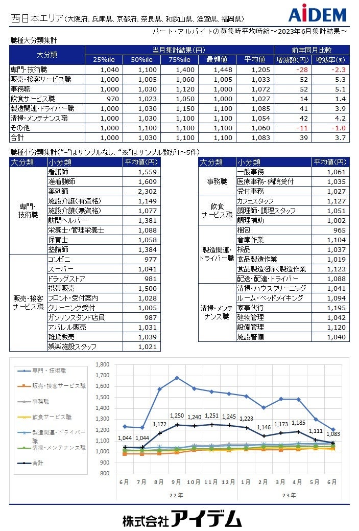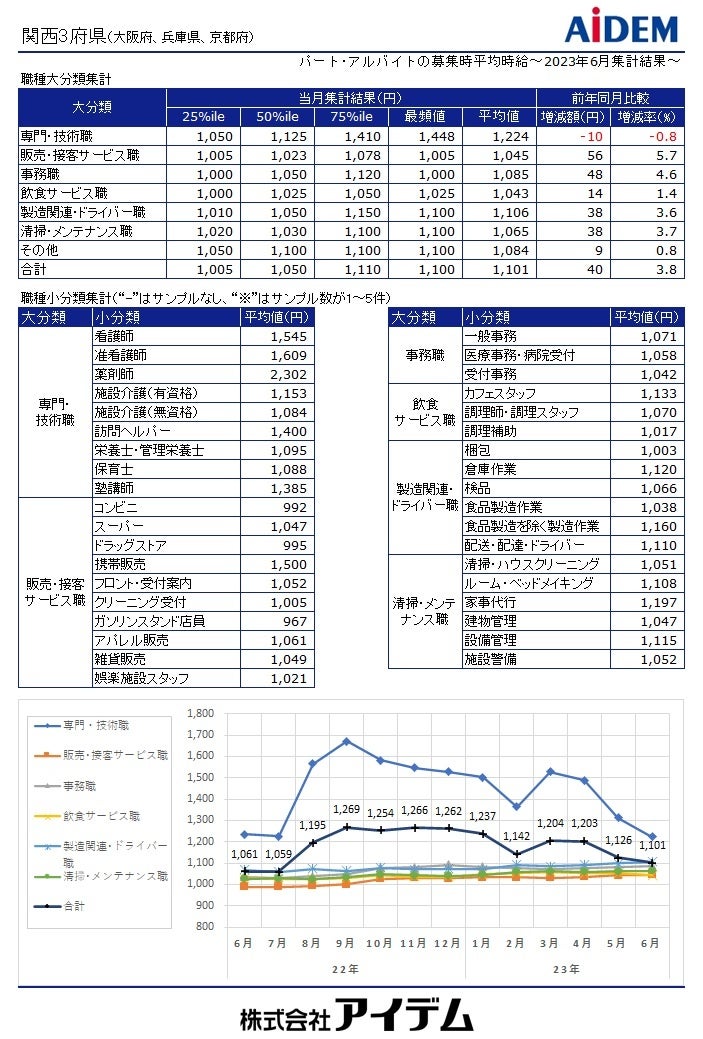 職種大分類別の平均時給は、「専門・技術職」1,224円(前年同月比10円減)、「製造関連・ドライバー職」1,106円(同38円増)、「事務職」1,085円(同48円増)、「清掃・メンテナンス職」1,065円(同38円増)、「販売・接客サービス職」1,045円(同56円増)、「飲食サービス職」1,043円(同14円増)の順で、前年同月比でプラスが5職種、マイナスが1職種となった。府県別の平均時給は、大阪府1,138円(前年同月比44円増)、京都府1,086円(同34円増)、兵庫県1,056円(同39円増)の順となり、前年同月比で全ての府県がプラスとなった。