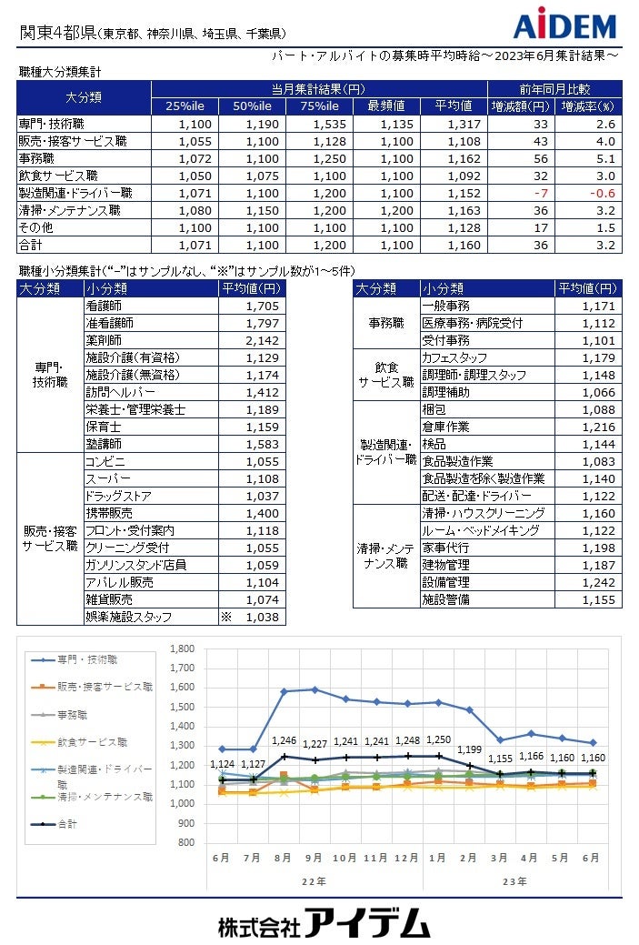 職種大分類別の平均時給は、「専門・技術職」1,317円(前年同月比33円増)、「清掃・メンテナンス職」1,163円(同36円増)、「事務職」1,162円(同56円増)、「製造関連・ドライバー職」1,152円(同7円減)、「販売・接客サービス職」1,108円(同43円増)、「飲食サービス職」1,092円(同32円増)の順で、前年同月比でプラスが5職種、マイナスが1職種となった。都県別の平均時給は、東京都1,191円(前年同月比20円増)、神奈川県1,166円(同24円増)、埼玉県1,119円(同61円増)、千葉県1,112円(同44円増)の順となり、前年同月比で全ての都県がプラスとなった。