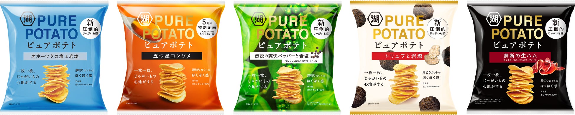 じゃがいもの濃い味わいと特有のホクホク感がご好評をいただいている「ピュアポテト」ブランドは、この9月で発売5周年を迎えるにあたり、“圧倒的なじゃがいも感”を感じられるポテトチップスとしての独自のポジションを確立し、さらなる飛躍を目指したフルリニューアルを実施いたしました。