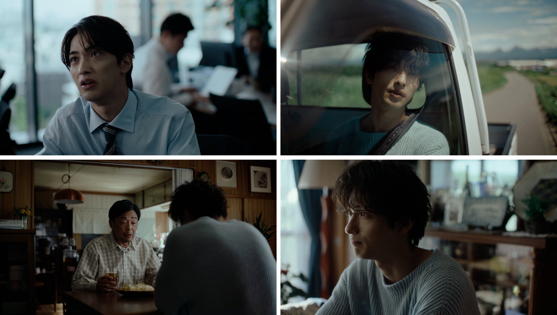 シーンが変わって、青年が3年ぶりに故郷に帰ります。光石研さん演じる父親の運転する軽トラに乗って、「変わんないなここは」と視線の先に広がる広大な北海道の大地を見てつぶやきます。そして家に着き、父親と2人だけのリビングで静かにグラスに注がれたビールを飲みます。
