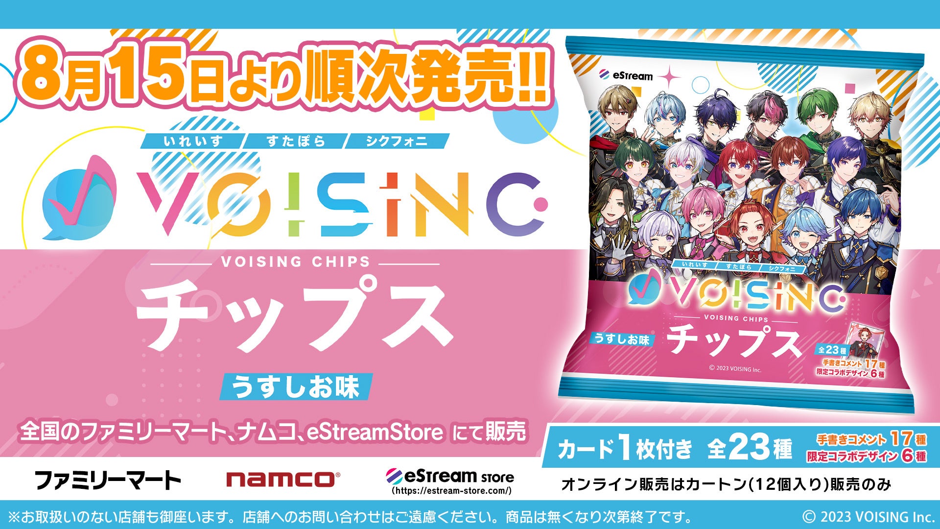 株式会社CyberZ(本社:東京都渋谷区、代表取締役社長:山内隆裕)の連結子会社、株式会社eStream(本社:東京都渋谷区、代表取締役社長:高井里菜)は、日本最大級の2.5次元アイドルグループ事務所「VOISING」とのコラボ商品『VOISINGチップス』を、2023年8月15日(火)より順次発売することを決定いたしました。本商品には、メンバーの手書きメッセージ入りデザインなどを含む全23種のオリジナルカードのうち、ランダムで1枚がおまけとしてついてきます。全国のファミリーマート、当社が運営する「eStream Store」で販売するほか、株式会社バンダイナムコアミューズメントが運営する全国の直営アミューズメント施設「namco」とネットクレーンモール「とるモ」にても順次展開いたします。