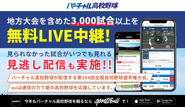「SPORTS BULL」内で展開するバーチャル高校野球はKDDI協力のもと地方大会3,000試合以上を中継予定