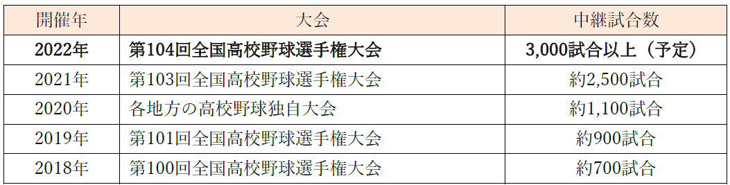 2022年の「バーチャル高校野球」では、KDDIの協力のもと、3,000試合以上の地方大会ライブ中継を予定しています。準決勝以降の試合は、49地方大会全大会でお届けします。