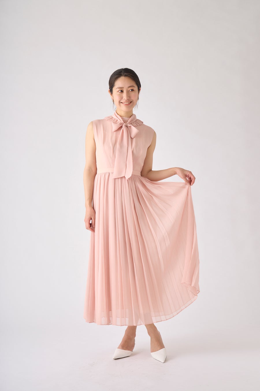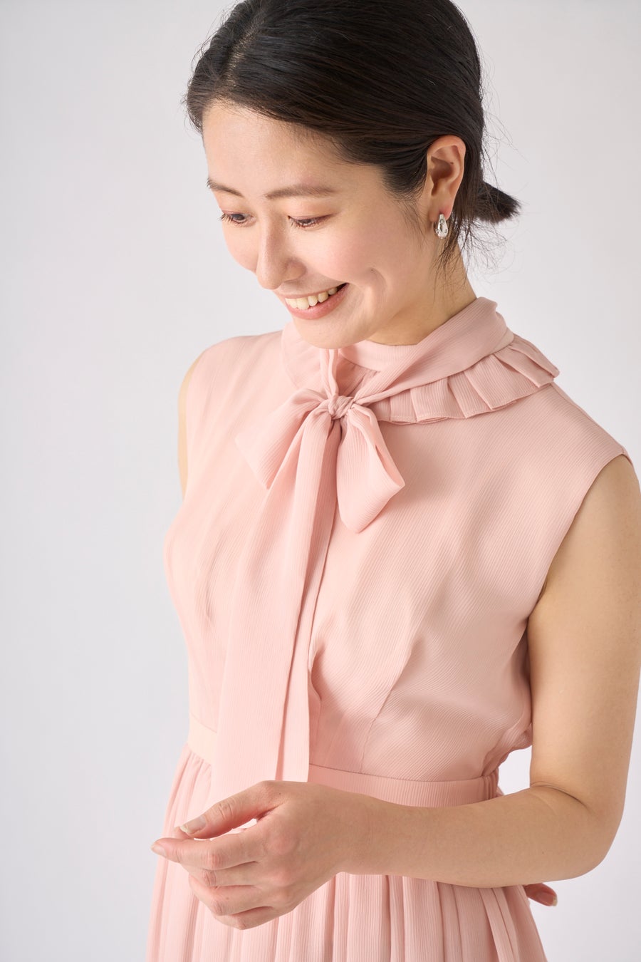 衿もとににタックフリルを施し、取り外しのボウタイリボンでお顔回りを華やかに演出します。スカートにはランダムな幅のプリーツを施し、動くたびに軽やかな動きが楽しめるワンピースです。