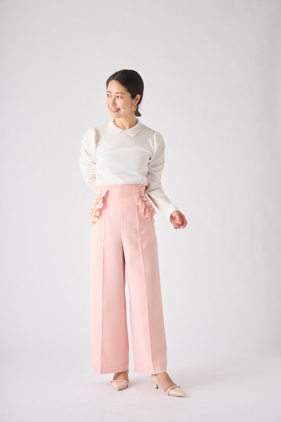 ハイウエストのデザインに加え、フロントに施したフリルも高めの位置に付けているので、腰位置を高く見せてくれるためスタイルアップ効果もあり、着用するだけで華やかなコーディネートに仕上げてくれます。