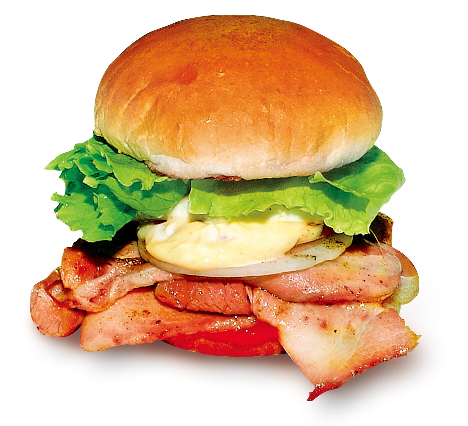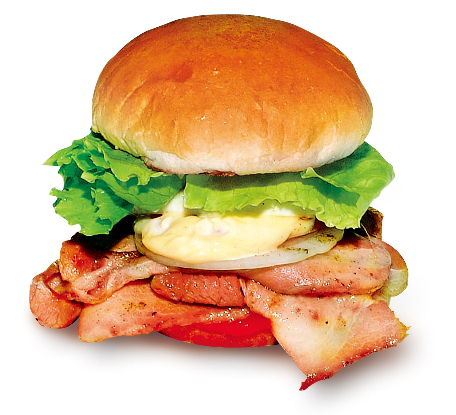 1970 年創業の佐世保バーガーの老舗。自家製のスモークベーコンが特徴の食べ応え抜群の一品。