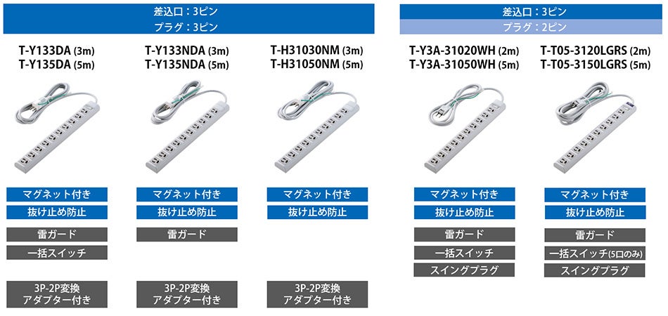 3ピンプラグの機器をそのまま挿し込めるうえ、差込口に「抜け止め防止」機能を備えた10口仕様の電源タップです。マグネット付きなのでスチール面に簡単に仮固定できます。電源プラグ側が3ピン仕様の3製品と2ピン仕様の2製品をご用意し、各製品で2種類のコード長をラインアップしています。3ピン仕様には3P→2P変換アダプターが付属します。2ピン仕様はスイングプラグを採用し、狭い場所のコンセントにも差し込みやすくなっています。