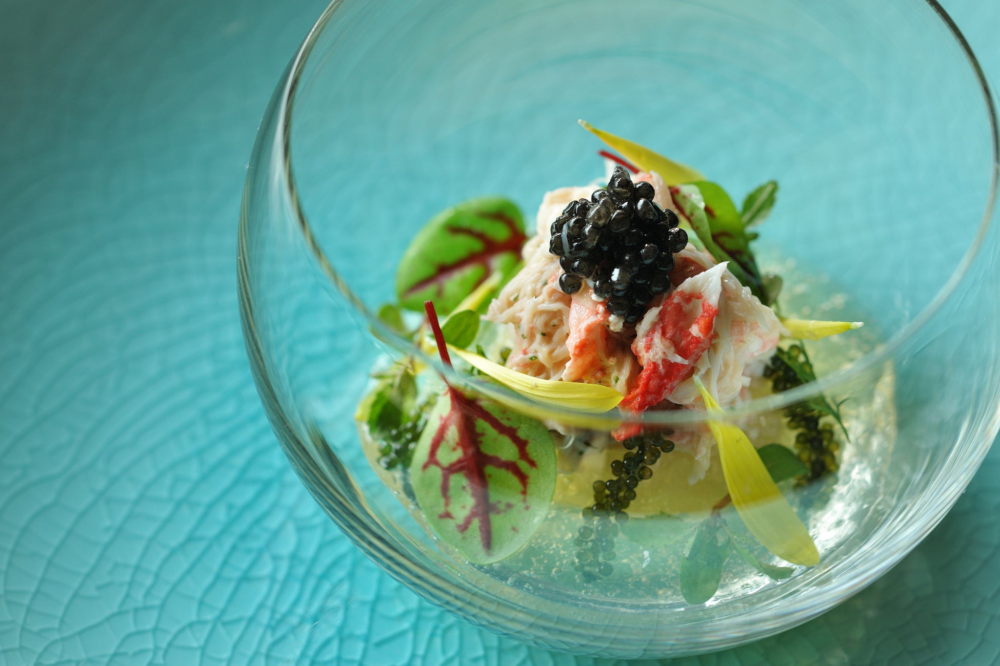 肉厚で甘みのあるガザミ(ワタリガニ)と春に旬を迎えるニンニクを、爽やかなサラダ仕立てで楽しめる一品。竹富島では、ニンニクは子孫繁栄の縁起物として親しまれ、祭事食などで振舞われています。そのニンニクを滑らかな口当たりとコクのある味わいのババロアに仕上げ、ニンニクと相性の良いガザミと合わせました。キャビアや海ブドウ、トマトのジュレを添えることで塩味や酸味が絶妙に調和します。春の食材を贅沢に堪能できる一皿です。