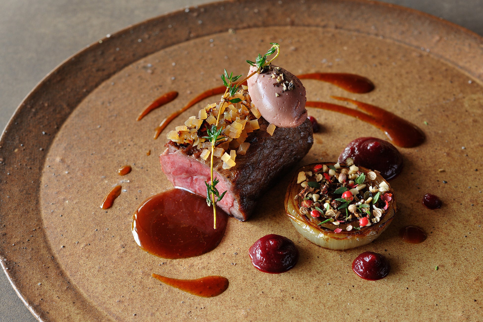 熟成肉に沖縄の郷土料理「ジージキ」を合わせた発酵の香りと深みのある味わいが感じられる一品です。ジージキとは、黒糖を使用した沖縄の漬物です。炭火で香ばしくローストされた牛肉と玉ねぎのジージキを合わせ、さらに味噌漬けにしたレバーペーストを合わせることで、コクのある風味を引き立てました。アクセントに、ピーヤシ(島胡椒)やピンクペッパーなどのスパイスを添えています。伝統の味わいと発酵食品が融合した一皿です。