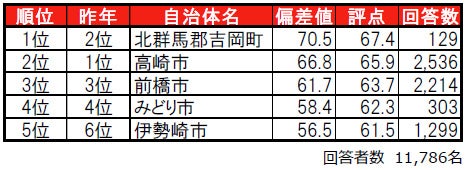 住みここちは、1位北群馬郡吉岡町、2位高崎市。3位は2年連続で前橋市。