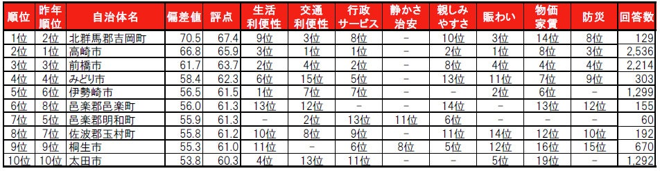 街の住みここちランキング2025<群馬県版>自治体TOP10・因子別順位