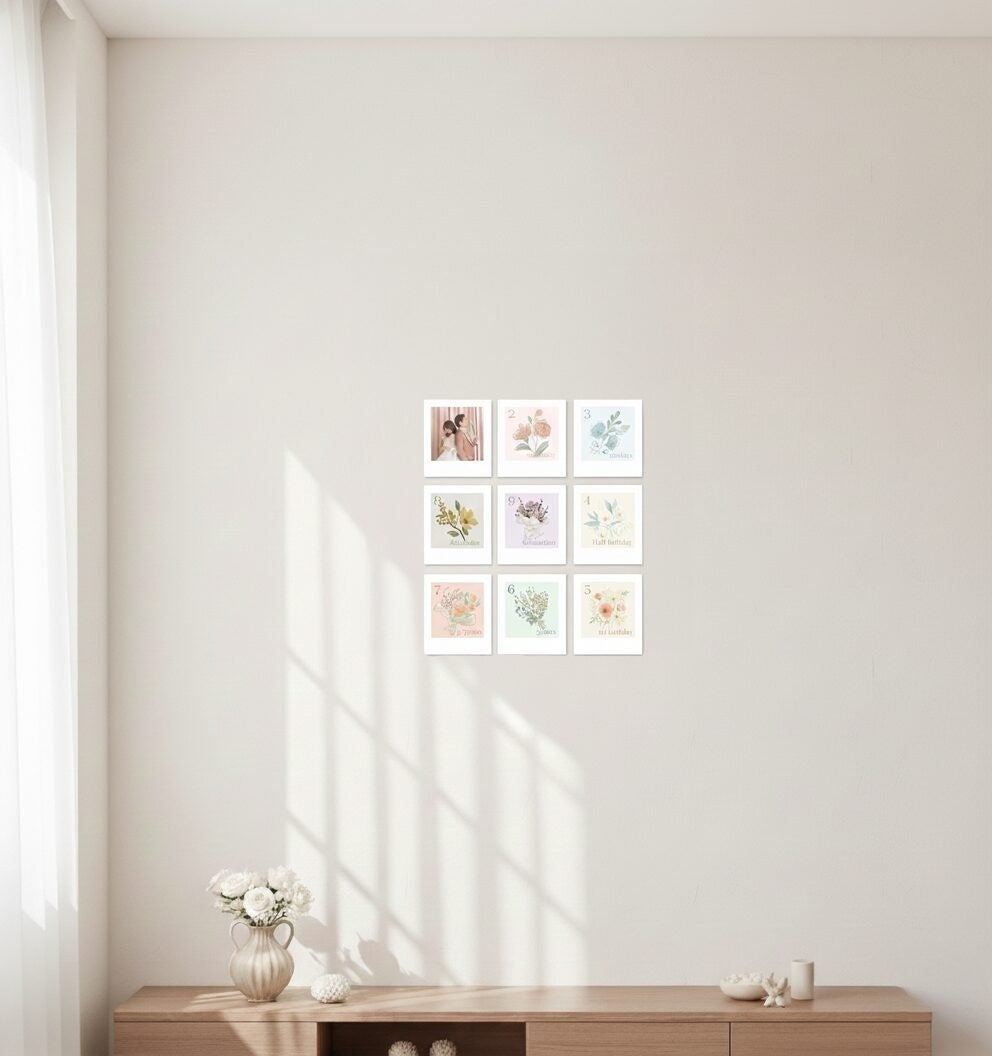 ブライダルフォトから始まったこのプロジェクト。トレンドを熟知した専属デザイナーが、9枚のパネル(90mm×100mm)を組み合わせた際の美しさを計算し尽くしました。ただのフォトフレームではない、飾るだけで空間がおしゃれになる「作品」としての価値を提供します。
