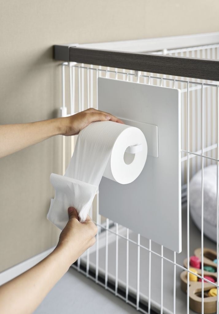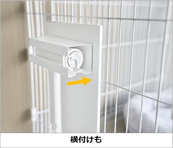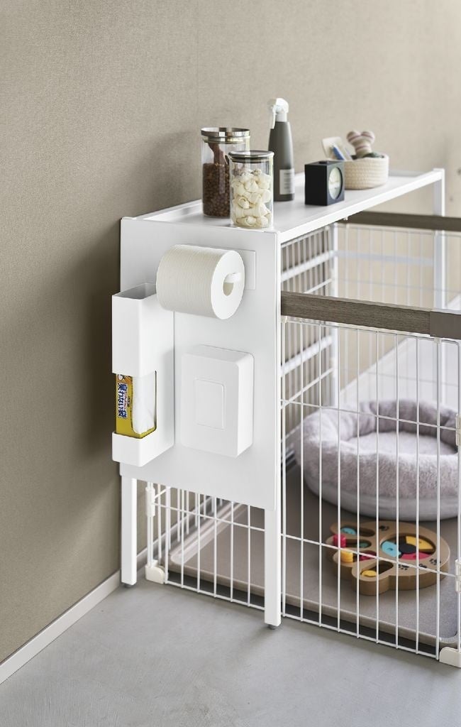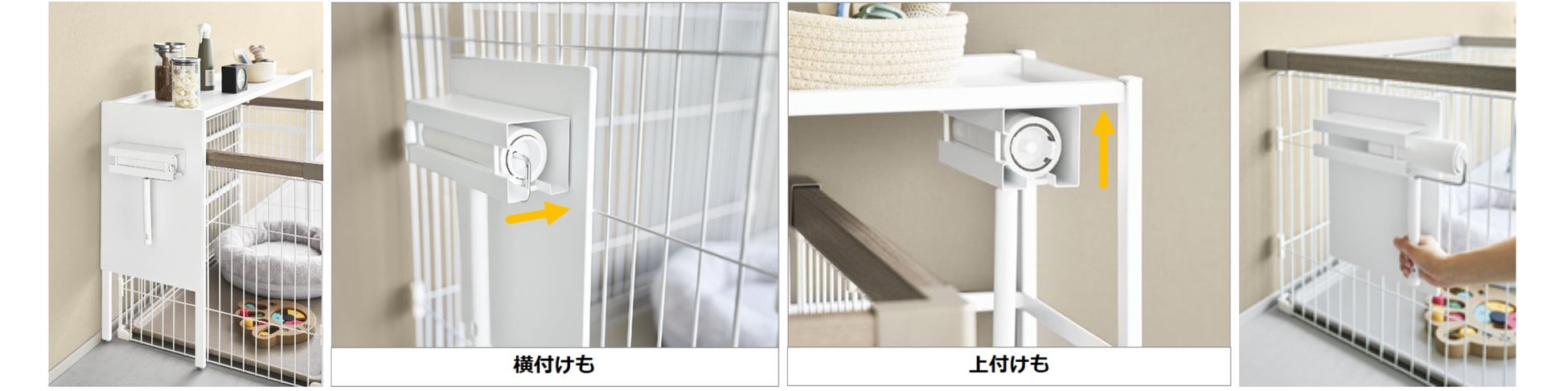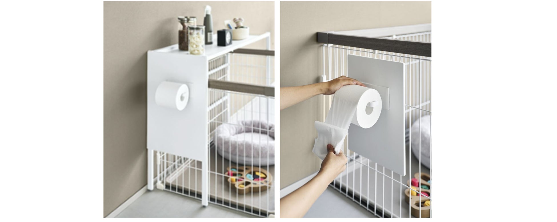 「ケージ上収納ラック」に別売のスチールプレートを取り付けることで、マグネット付きの収納シリーズを組み合わせることができます。トイレットペーパーやトイレシーツなどのトイレ用品やクリーナーなどケージ周りの必需品を便利に収納できます。