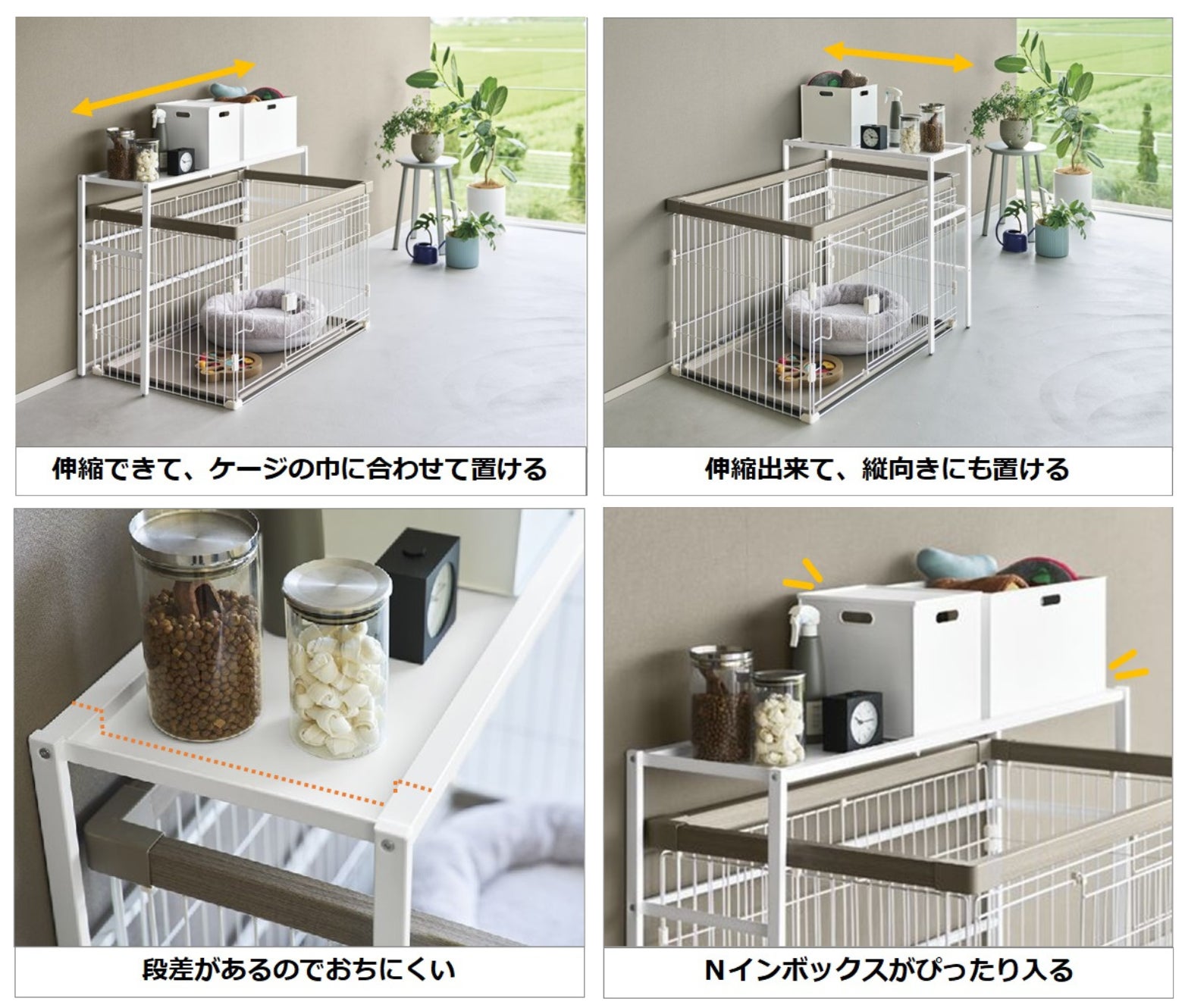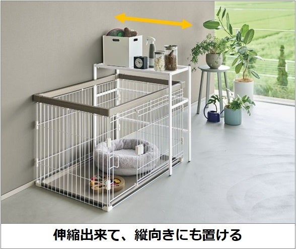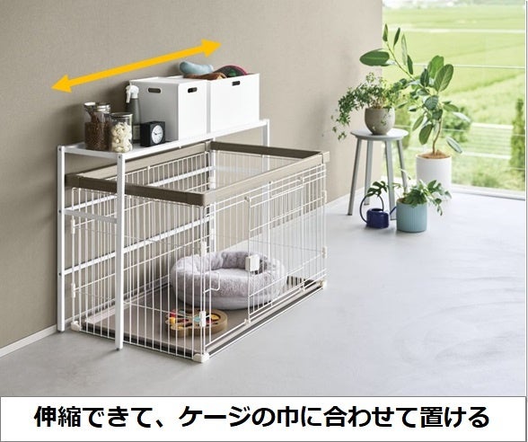 メイン商品である「ケージ上収納ラック」は、ペットケージの上部空間を活用できる専用収納ラック。幅は約70~128cmに伸縮できるので、今お持ちのケージサイズに合わせてお使いいただけます。