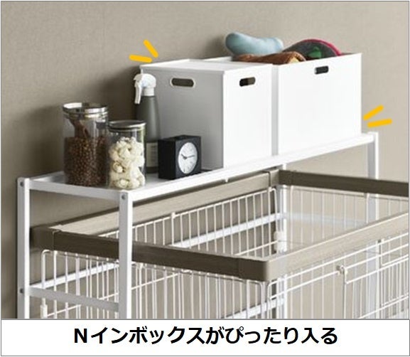 ラック部分は、上に置いたものが落下しないようこぼれ止めを付け、ニトリの「バスケットNインボックス」がぴったり収まるサイズです。そのためバスケットにおもちゃやトイレシーツなどを入れて収納することができます。